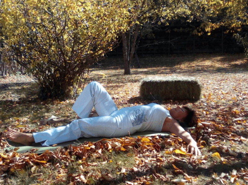 Sdraiato a terra entro nel Respiro Yogico completo.